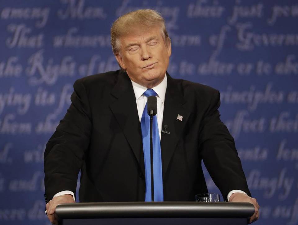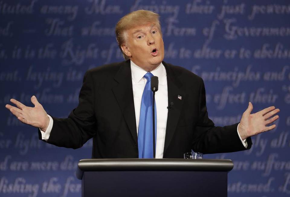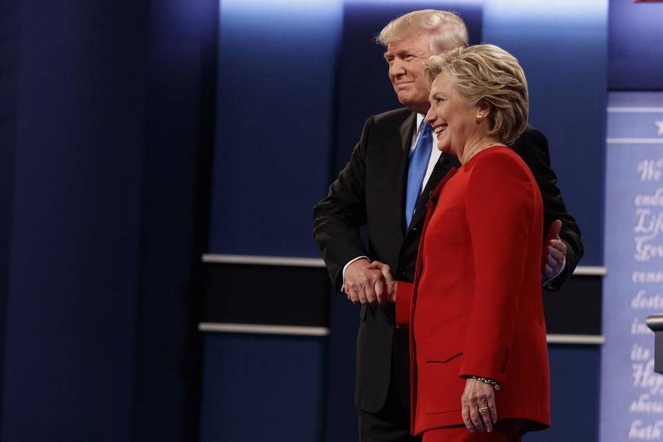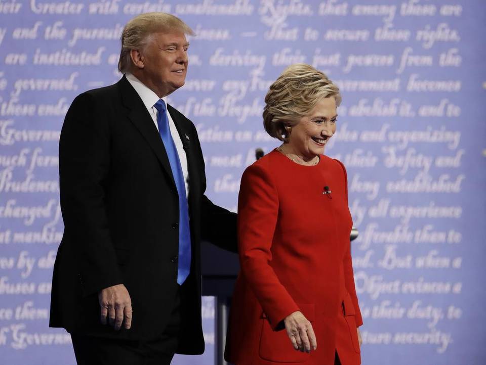 | Donal Trump đại diện đảng Cộng Hòa mặt mày nhăn nhó đứng bên cạnh bông hoa tươi cười của đảng Dân Chủ là cựu Ngoại trưởng Hillary Clinton trước khi tranh luận chiếu 26/9/2016