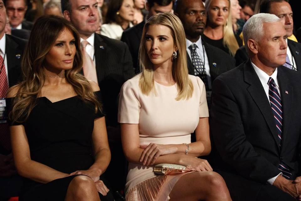 | Vợ của Trump là Melania Trump, con gái Ivanka Trump và ứng cử viên Phó Tổng thống Mike Pence (phải) |