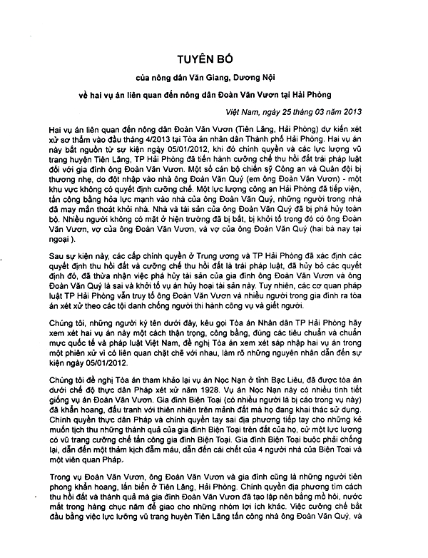 TUYÊN BỐ CỦA NÔNG DÂN VĂN GIANG VÀ DƯƠNG NỘI VỀ HAI VỤ ÁN LIÊN QUAN ĐẾN NÔNG DÂN ĐOÀN VĂN VƯƠN TẠI HẢI PHÒNG ..