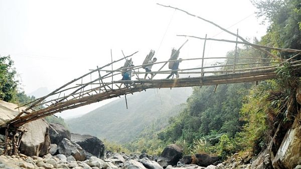 < Con đường đi làm nương của người dân xã Nậm Tăm (Sìn Hồ, Lai Châu) phải qua những cây cầu treo tạm bợ.
