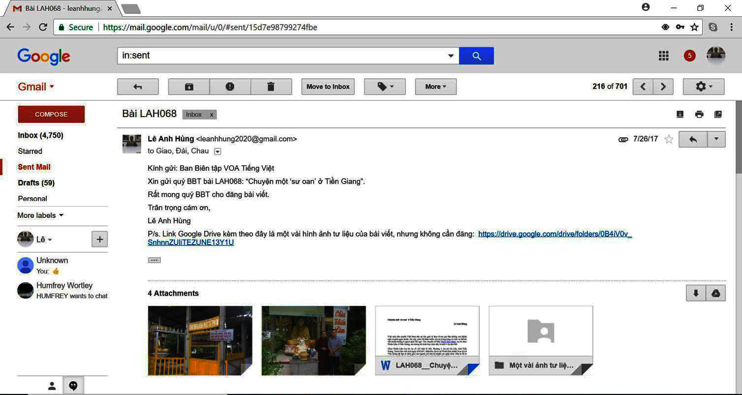 Nhân đây, tôi cũng gửi cho ông bức thư nhan đề “Những trò phá hoại nhằm vào Blog Lê Anh Hùng trên VOA” mà tôi đã gửi cho bà Judy Nguyen, cựu Trưởng ban VOA Việt ngữ, ngày 17/6/2016. Tôi muốn nhắc lại rằng, tình trạng blog Lê Anh Hùng trên VOA bị phá hoại đã diễn ra từ lâu, nhưng lúc đó vì thủ phạm phá hoại mới chỉ ở tầm nhân viên và đặc biệt là vì tôi tin tưởng bà Judy Nguyen nên tôi đã gửi thư riêng cho bà. Còn bây giờ thủ phạm lại chính là đương kim Trưởng ban VOA Việt ngữ thì tôi không còn cách nào khác là buộc phải công khai vụ việc.
