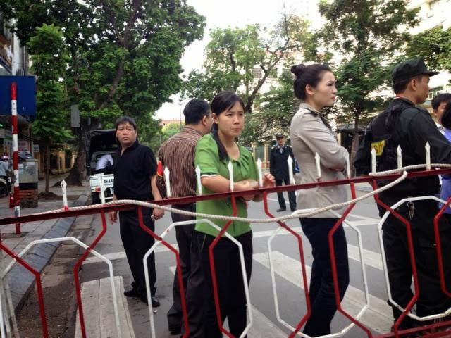 08h15: Hàng rào chặn có 2 lớp: an ninh mặc thường phục đứng trước, cảnh sát cơ động đứng phía sau.