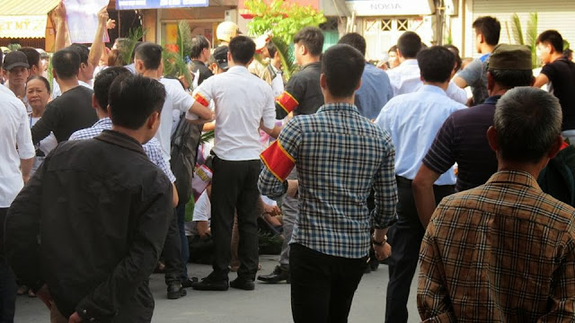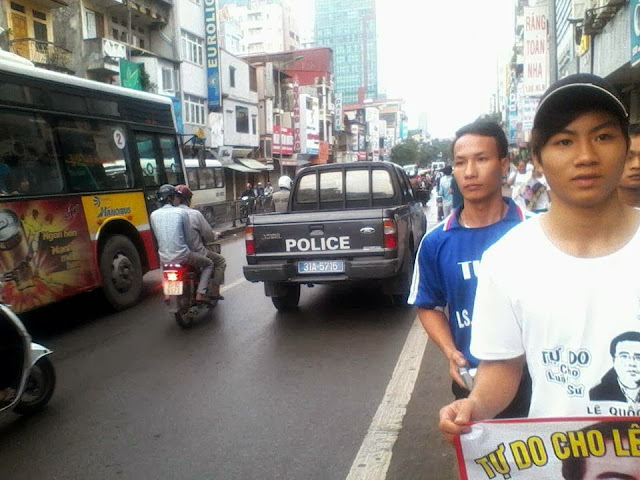 08h01: Bà con vẫn ngồi xuống đường và giương biểu ngữ đòi trả tự do cho LS Quân. Bà con người Mường Hòa Bình bắt đầu đánh cồng vang động cả một góc phố.