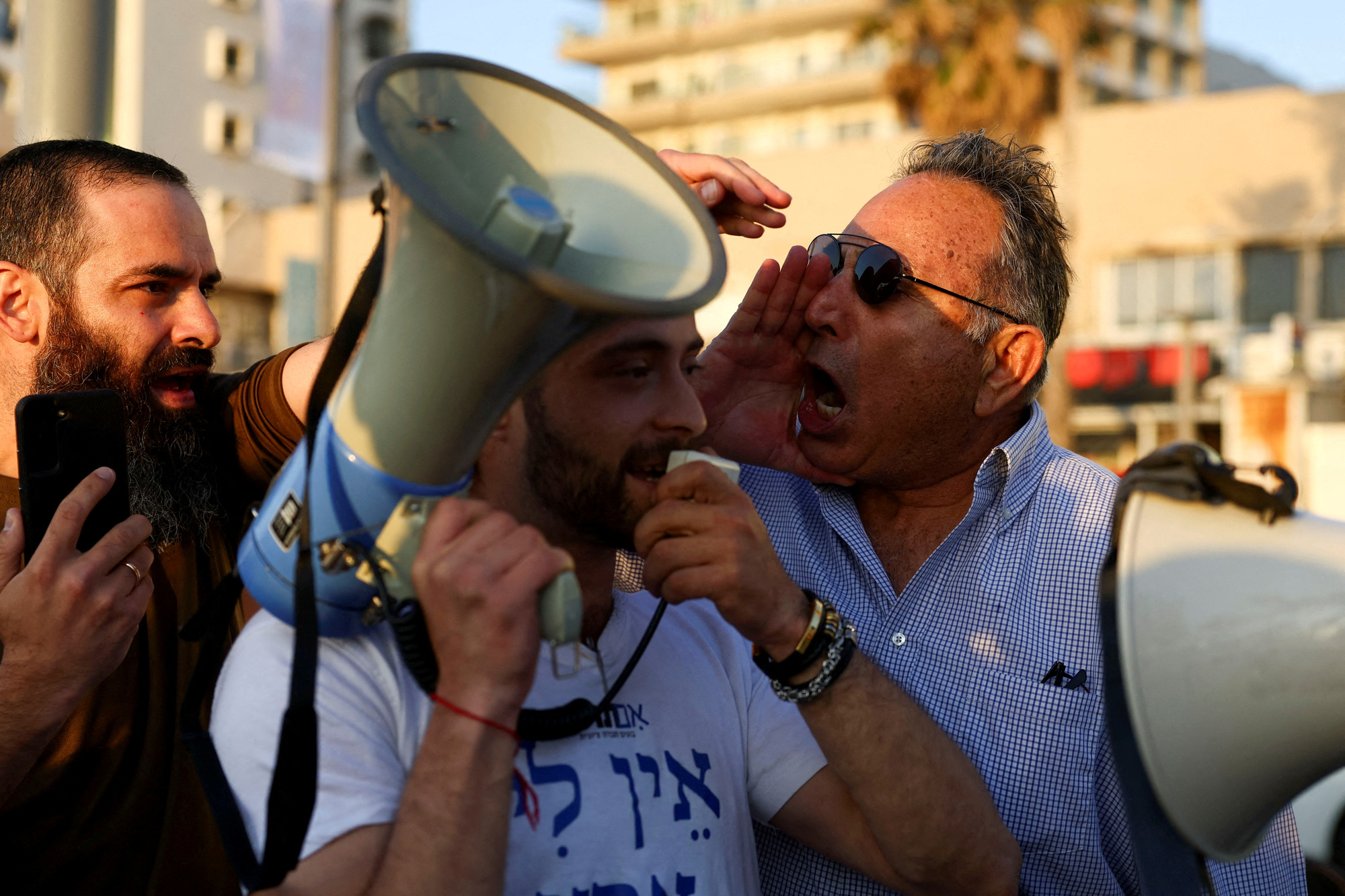 Người biểu tình tranh cãi bên ngoài Văn phòng chi nhánh Đại sứ quán Mỹ trong cuộc biểu tình ủng hộ Tổng thống Mỹ Joe Biden, sau khi Iran tấn công Israel, tại Tel Aviv, Israel ngày 15-4 - Ảnh: REUTERS