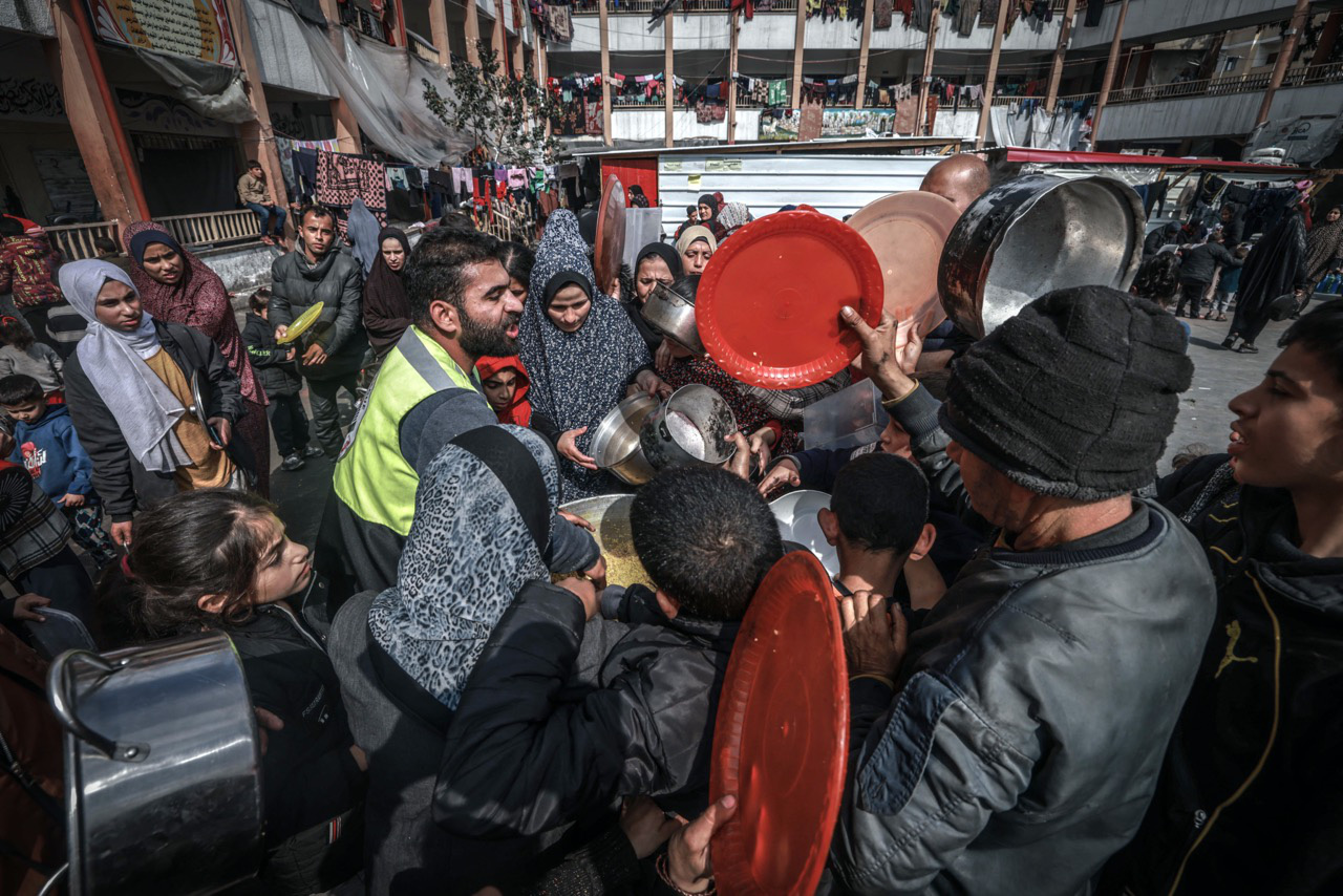 Những người Palestine di tản đang lấy thức ăn tại một ngôi trường ở thành phố Rafah, phía nam Dải Gaza hôm 19-2 - Ảnh: AFP