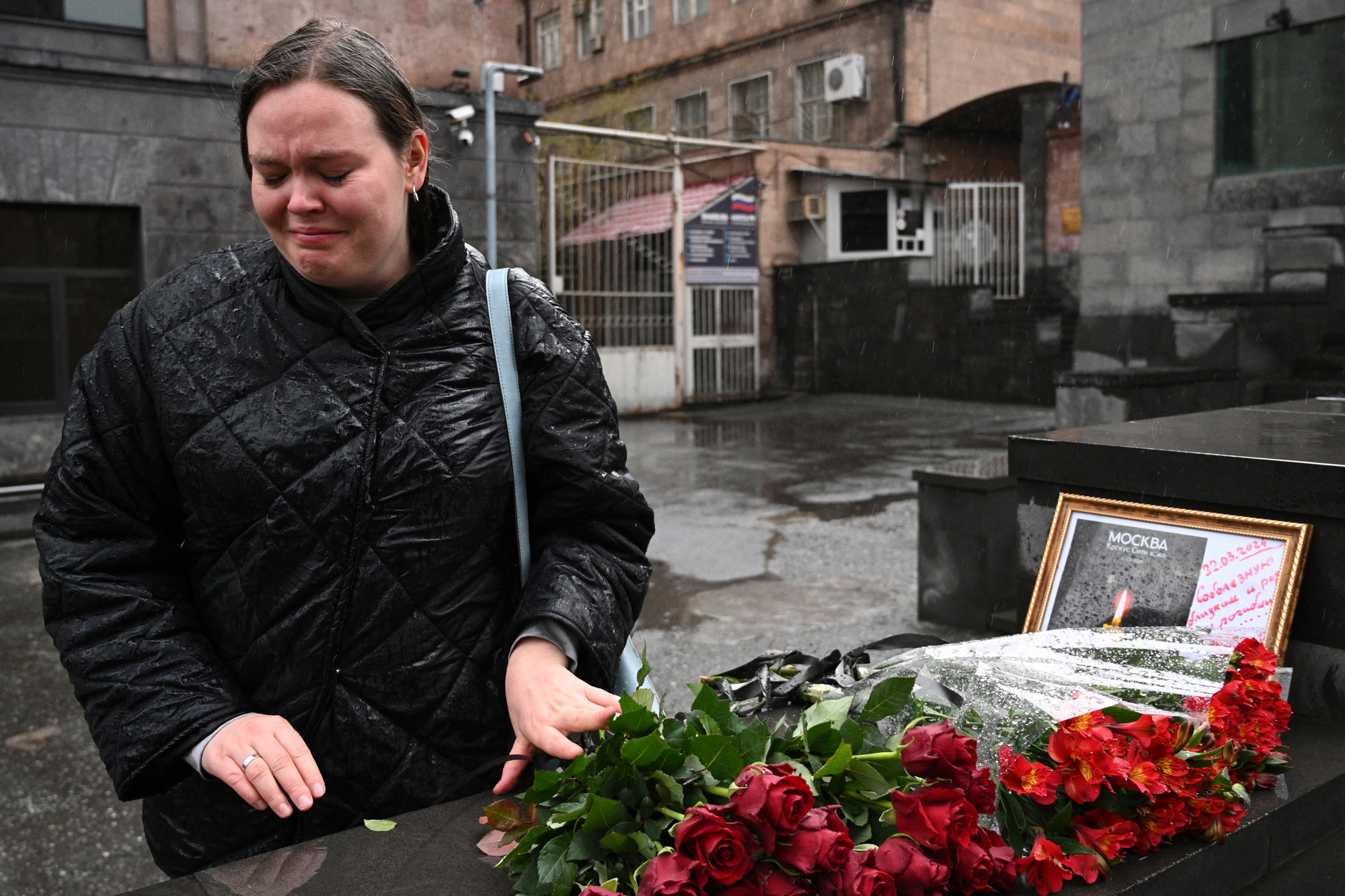 Một người phụ nữ rơi nước mắt khi đặt hoa tại khu vực tưởng niệm tạm thời trước Đại sứ quán Nga ở Yerevan của Armenia, ngày 23-3, một ngày sau vụ xả súng ở Nga - Ảnh: AFP