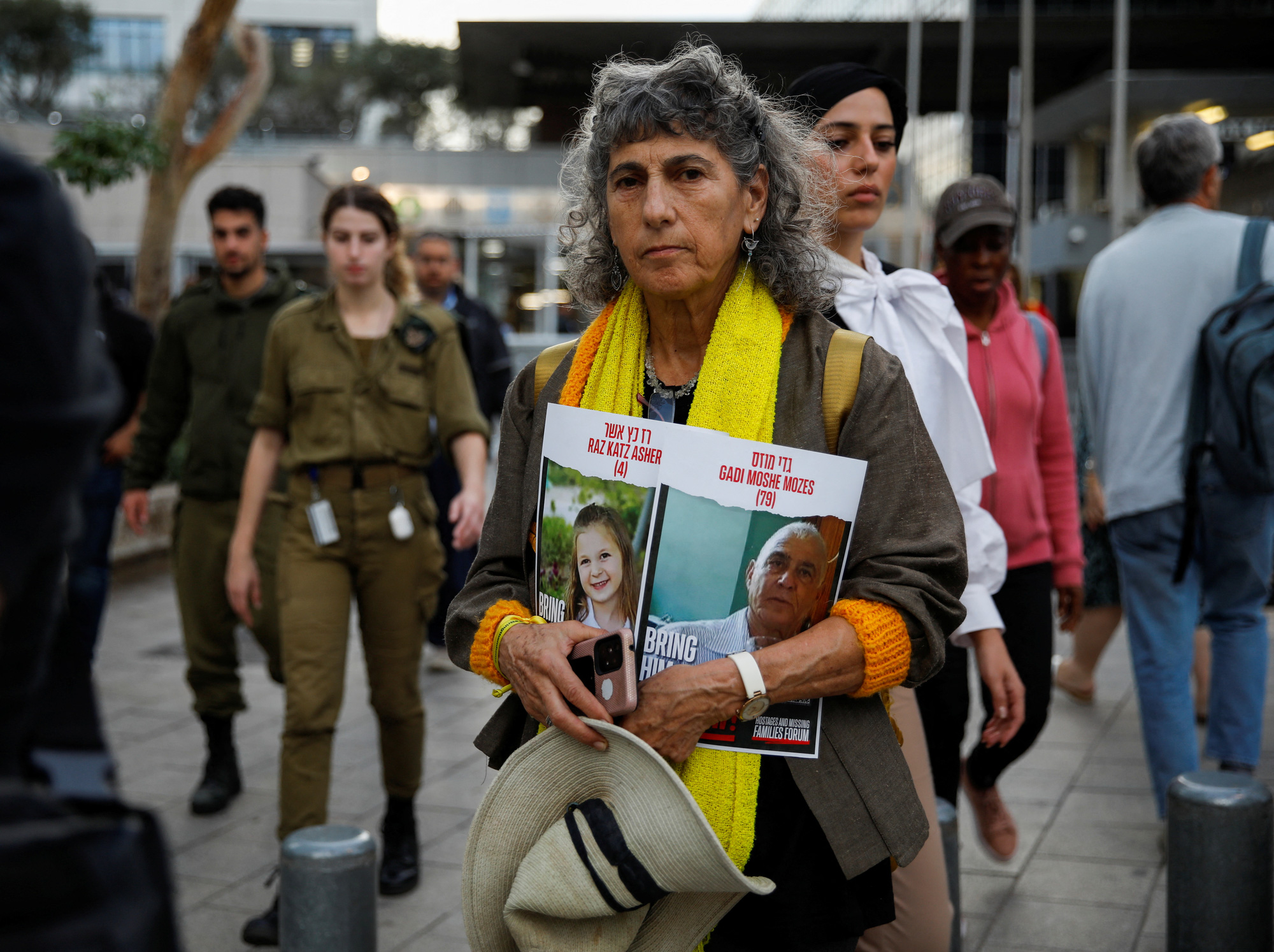 Tại Tel Aviv (Israel), một người cầm tấm biển kêu gọi trả tự do cho các con tin bị Hamas bắt giữ - Ảnh: REUTERS