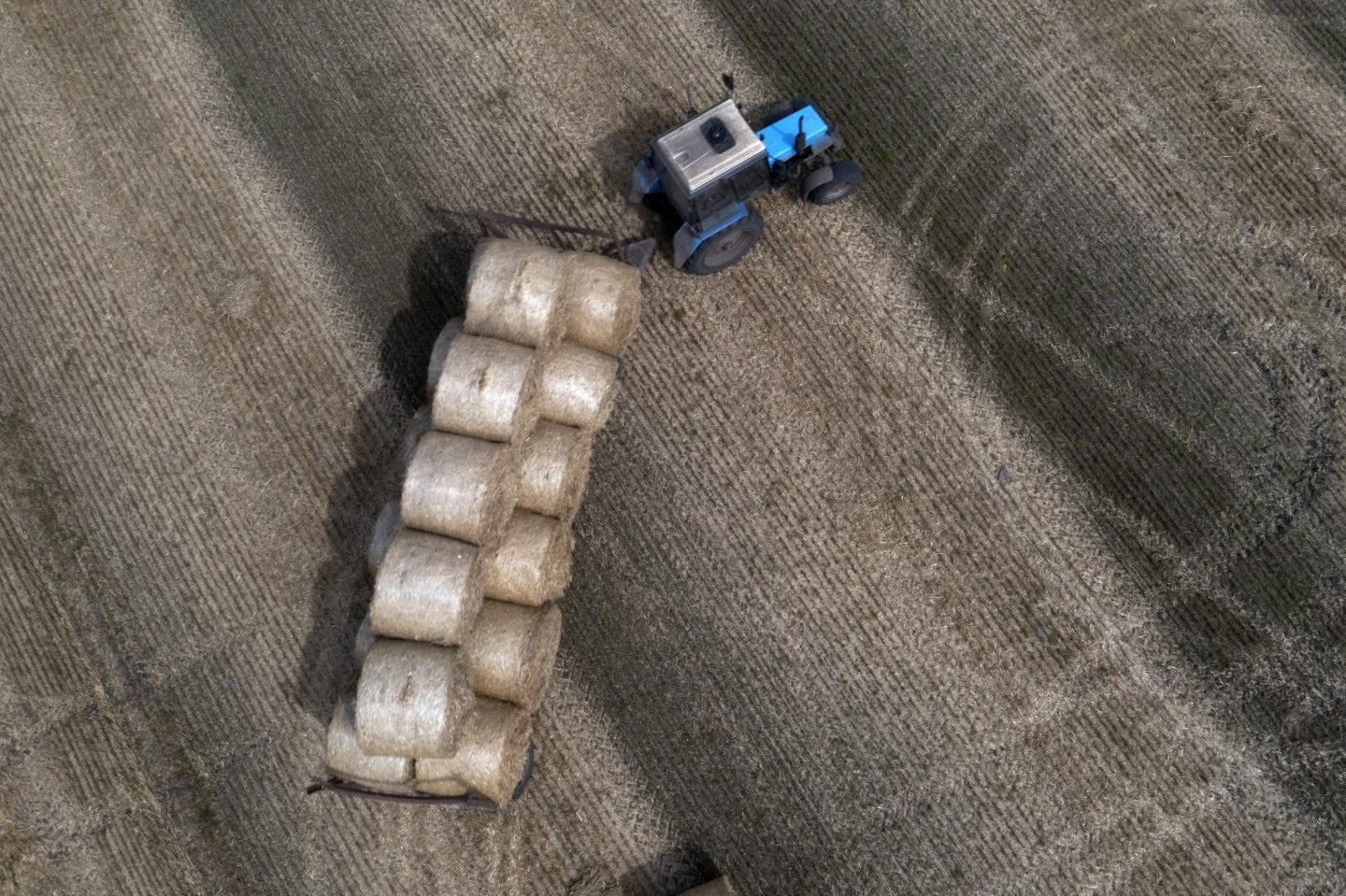 Một chiếc máy thu gom và cuộn rơm đang hoạt động trên cánh đồng của một trang trại tư nhân ở Zhurivka, vùng Kiev, Ukraine hôm 10-8 vừa qua - Ảnh: AP/Efrem Lukatsky