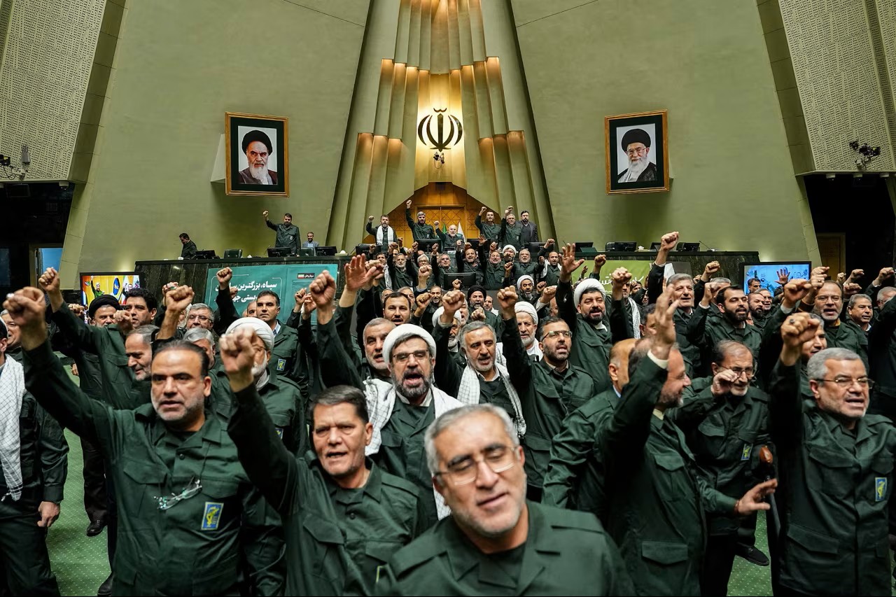thành viên Quốc hội Iran mặc quân phục, hô vang khẩu hiệu ủng hộ Lực