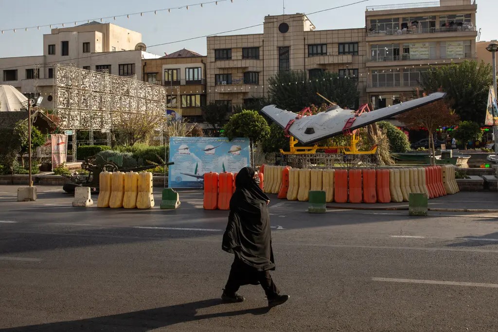 Một chiếc máy bay không người lái được trưng bày trong một triển lãm quân sự ở Tehran năm 2025 - Ảnh: NEW YORK TIMES
