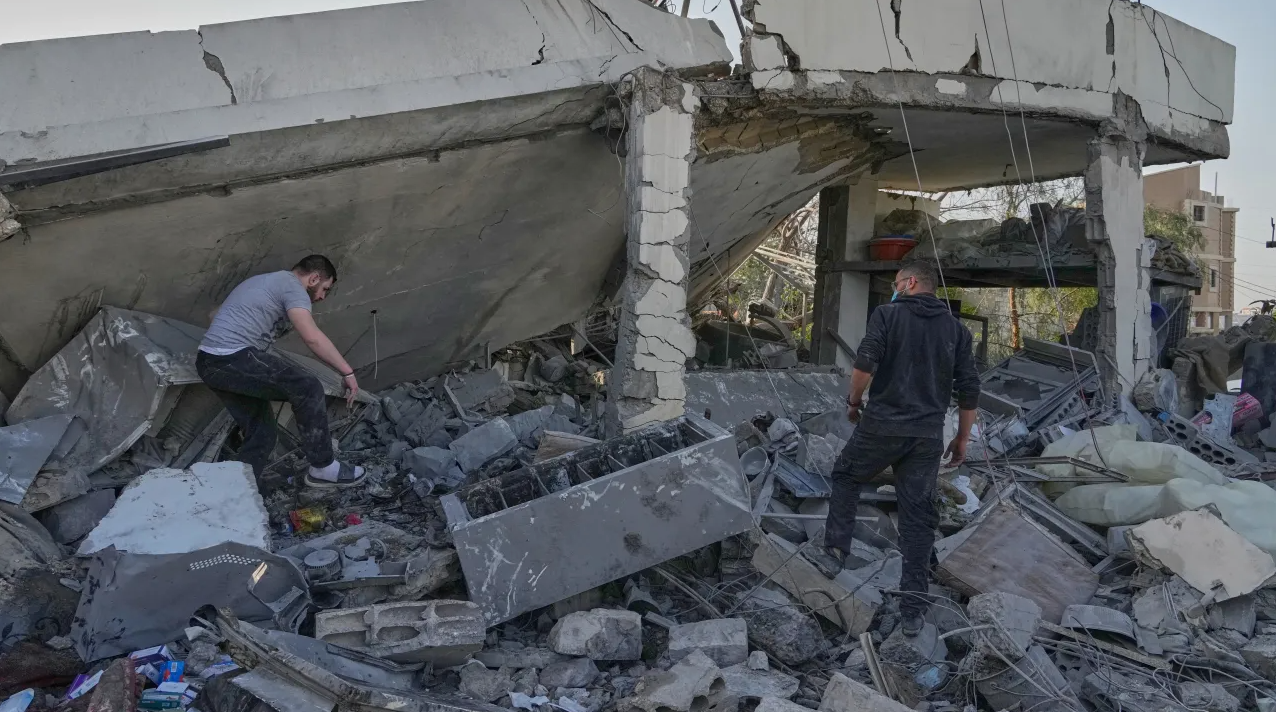Người dân kiểm tra ngôi nhà bị Israel không kích khiến nhiều người trong một gia đình thiệt mạng tại làng Erkay, miền Nam Lebanon ngày 12-3. Ảnh: AP