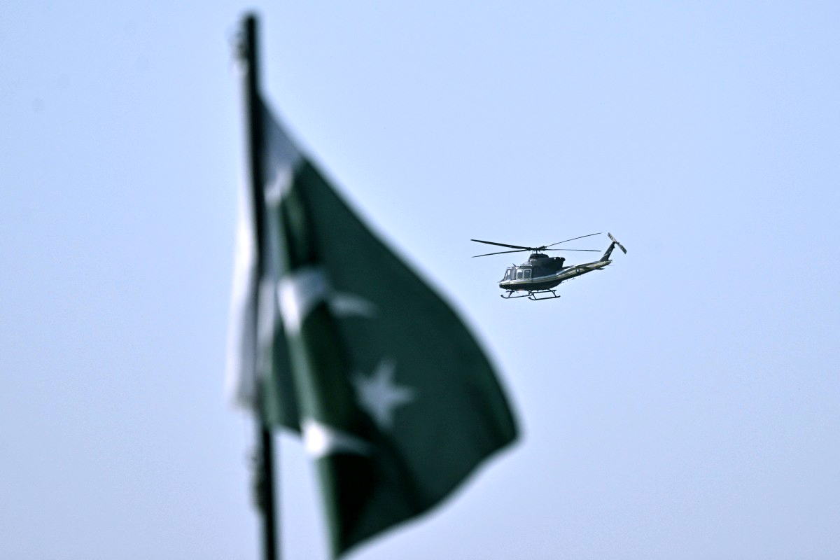 Các đặc phái viên Mỹ đã lên đường tới thủ đô của Pakistan vào ngày 25-4 nhằm khởi động vòng đàm phán hòa bình mới với Iran, dù triển vọng đàm phán trực tiếp vẫn chưa chắc chắn. Trong ảnh, một chiếc trực thăng bay qua "vùng đỏ" ở Islamabad ngày 25-4 - Ảnh: AFP