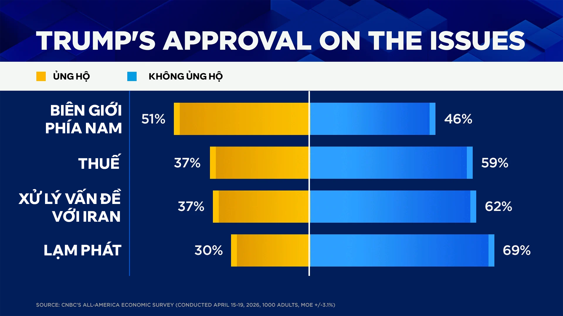 Tỷ lệ ủng hộ tổng thể cũng như về kinh tế của Tổng thống Donald Trump đã lao dốc trong cuộc khảo sát "Kinh tế Toàn nước Mỹ" (All-America Economic Survey) mới nhất của CNBC. Đây dường như là hệ quả trực tiếp từ sự bất mãn lan rộng đối với xung đột Iran, giá xăng dầu leo thang và những cái nhìn tiêu cực về nền kinh tế.