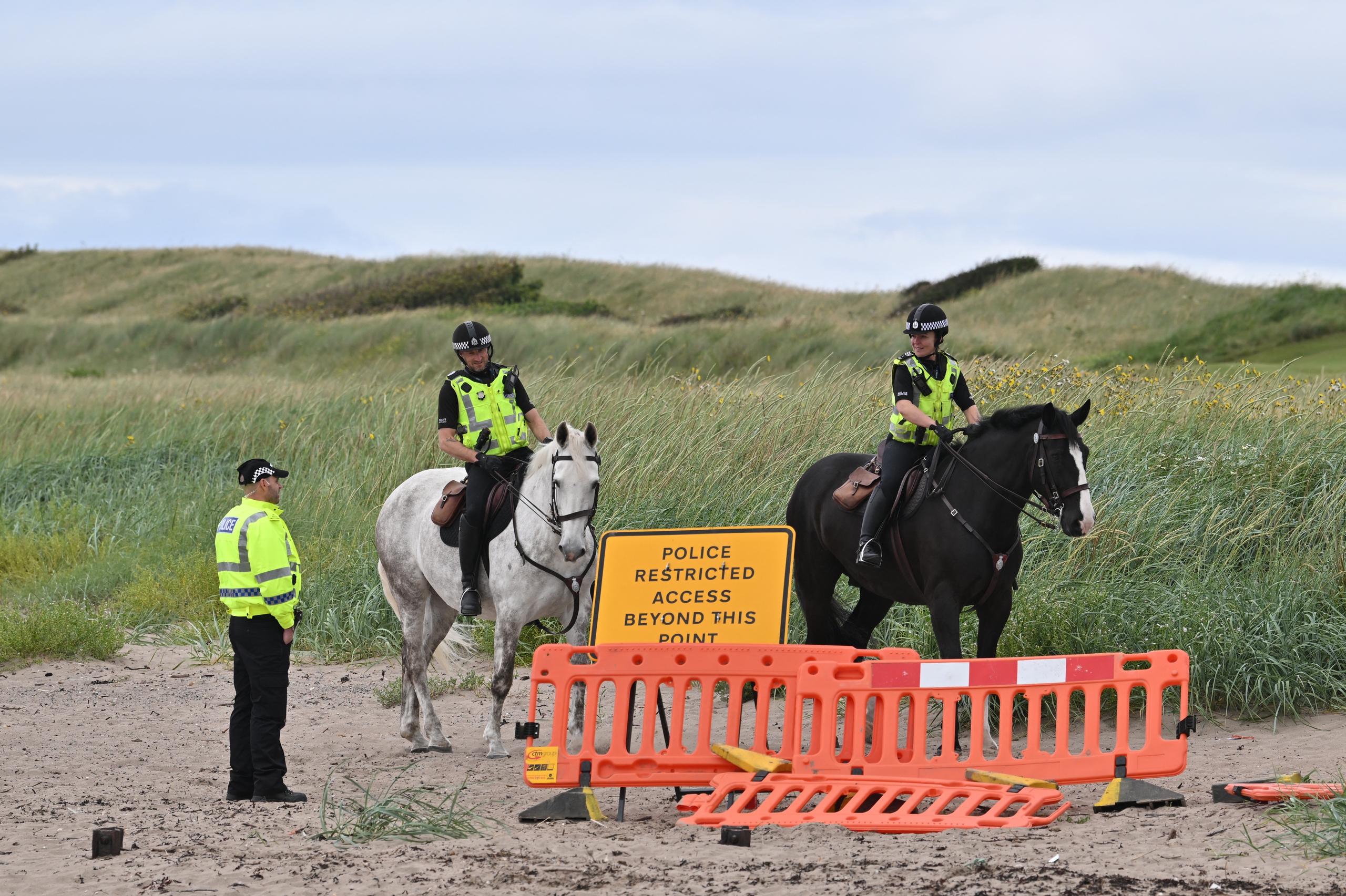 Cảnh sát cưỡi ngựa tuần tra bãi biển gần sân golf Trump Turnberry tại Turnberry, bờ biển tây nam Scotland hôm 25-7 - Ảnh: AFP