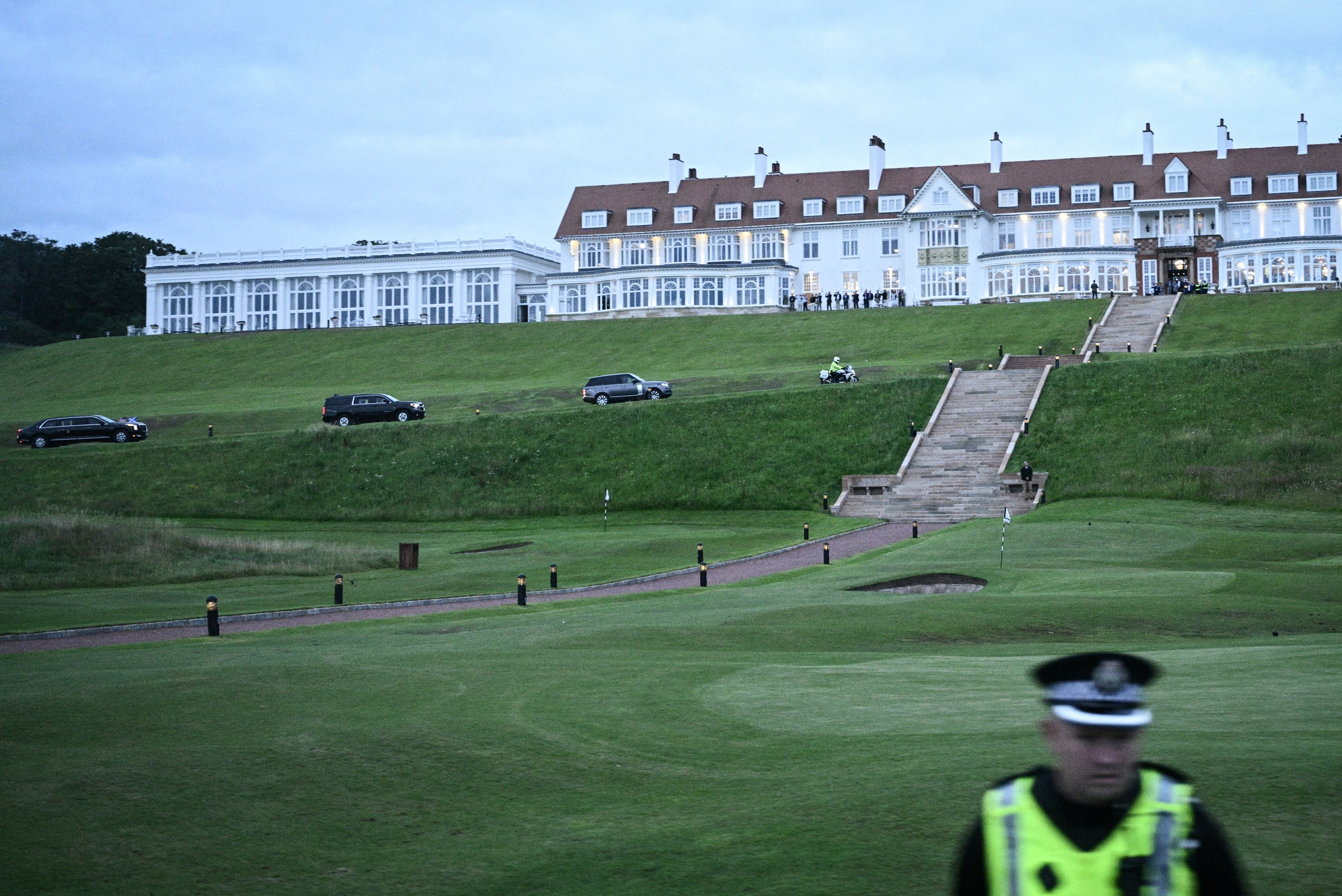 Sự hiện diện của ông Trump đã biến khu vực yên bình và nên thơ ở tây nam Scotland thành một pháo đài thực sự, với các con đường bị phong tỏa và các trạm kiểm soát của cảnh sát được thiết lập.