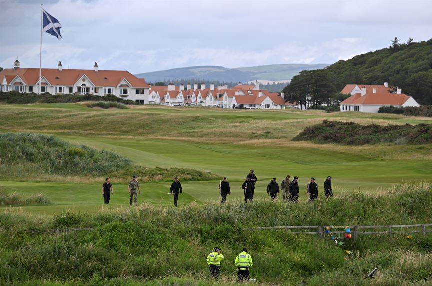 Cảnh sát và quân nhân kiểm tra tại sân golf trước khi ông Trump chơi golf tại Turnberry, bờ biển tây nam Scotland ngày 26-7 - Ảnh: AFP