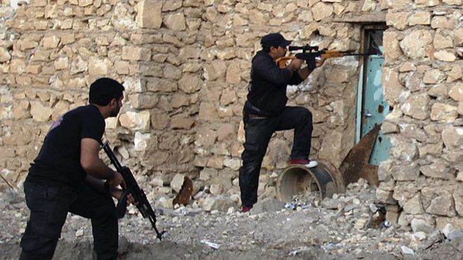 Cuộc giao tranh tiếp tục kéo dài sang ngày thứ Sáu và đến 14:00 giờ địa phương (11:00 GMT) người ta thấy cờ đen của IS được kéo lên bay trên nóc tòa nhà.