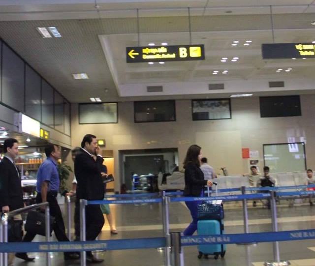 | Hình ảnh Huỳnh Đức Thơ xuống sân bay Nội Bài, lái xe Huỳnh Anh xách cặp đi đằng sau. |