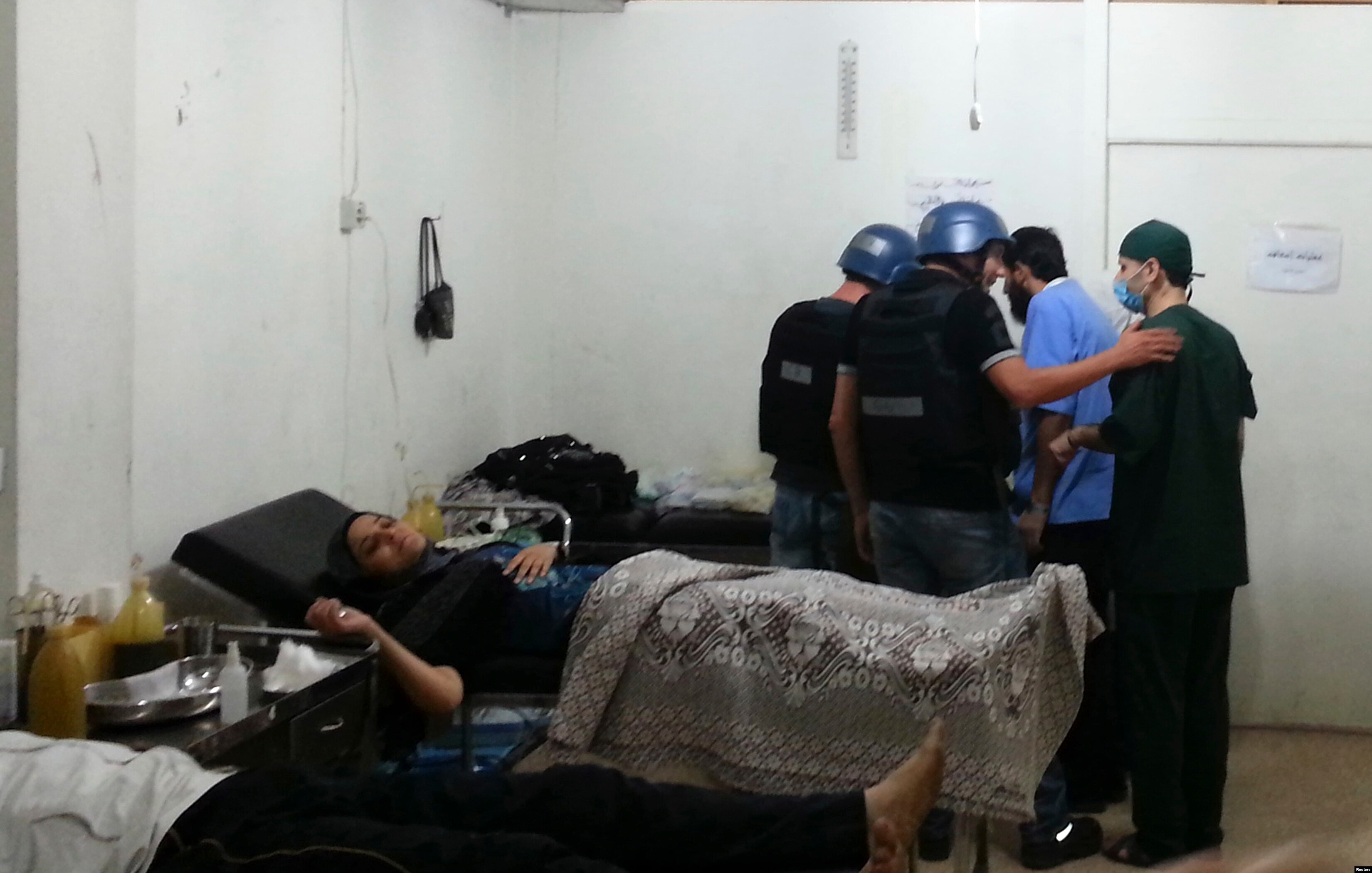 Dân Syria khiêng một người đàn ông bị thương vì vũ khí hóa học đến gặp các nhà điều tra LHQ tại vùng ngoại ô Damascus, ngày 28/8/2013. 9 VOA