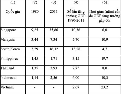 Theo Bảng 1, GDP đầu người của Singapore nhiều 9,25 lần GDP của Việt Nam vào năm 1980, và chênh lệch tới 35,86 lần vào năm 2011. Thái Lan và Indonesia chỉ hơn Việt Nam chút ít vào năm 1980 (1,35 và 1,14 lần), nhưng nay Indonesia gấp 2,5 lần và Thái Lan gấp gần 4 lần Việt Nam.