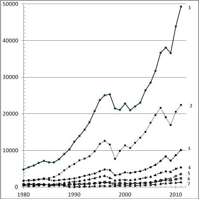 Thay đổi vị thứ. Trong vòng 31 năm qua, Singapore vẫn giữ hàng đầu. Tuy nhiên, Nam Hàn nhảy hạng từ thứ 3 của năm 1980 lên hạng 2 vào năm 1985, và Malaysia tuột hạng từ 2 xuống 3. Philippines từ hạng 4 xuống hạng 6 trong lúc Thái Lan nhảy từ hạng 5 lên hạng 4 từ 1987, và Indonesia nhảy lên hạng 5 từ 2005. Việt Nam vẫn tiếp tục giữ hạng chót trong số 7 quốc gia nói trên.