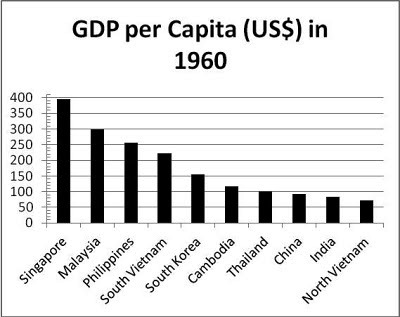 Theo biểu đồ 1, vào thời điểm 1960, trong số 10 quốc gia Á châu, Việt Nam Cộng Hòa (VNCH, South Vietnam, 223$) có GDP đầu người đứng sau Singapore (395$), Malaysia (299$), Philippines (257$), nhưng nhiều hơn Nam Hàn (155$), hơn gấp đôi Thailand (101$), gấp 2,4 lần Trung quốc (92$), gấp 2,7 lần Ấn độ (84$), và gấp 3 lần Việt Nam Dân Chủ Cộng Hòa (North Vietnam, 73$).