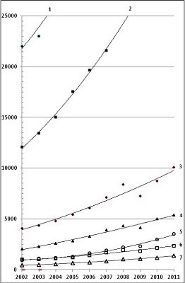 | Biểu đồ 5. Tiên đoán GDP đầu người do IMF thực hiện cho thời kỳ 2011 – 2017 cho Malaysia (3), Thái Lan (4), Indonesia (5), Philippines (6) và Việt Nam (7). Vẽ từ tài liệu của IMF (1) |
