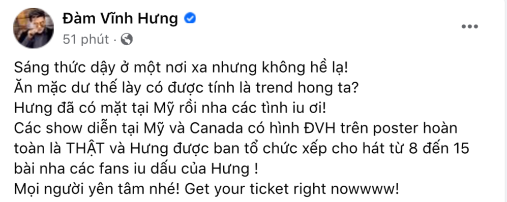 Tuy nhiên, sáng 11/11, Đàm Vĩnh Hưng bất ngờ thông báo đã sang Mỹ. Trước đó từng xuất hiện tin đồn Đàm Vĩnh Hưng đối mặt với mức phạt 6 tỷ đồng và lệnh cấm nhập cảnh Mỹ nên việc nam ca sĩ rời Việt Nam khiến dân tình dành sự chú ý đặc biệt.