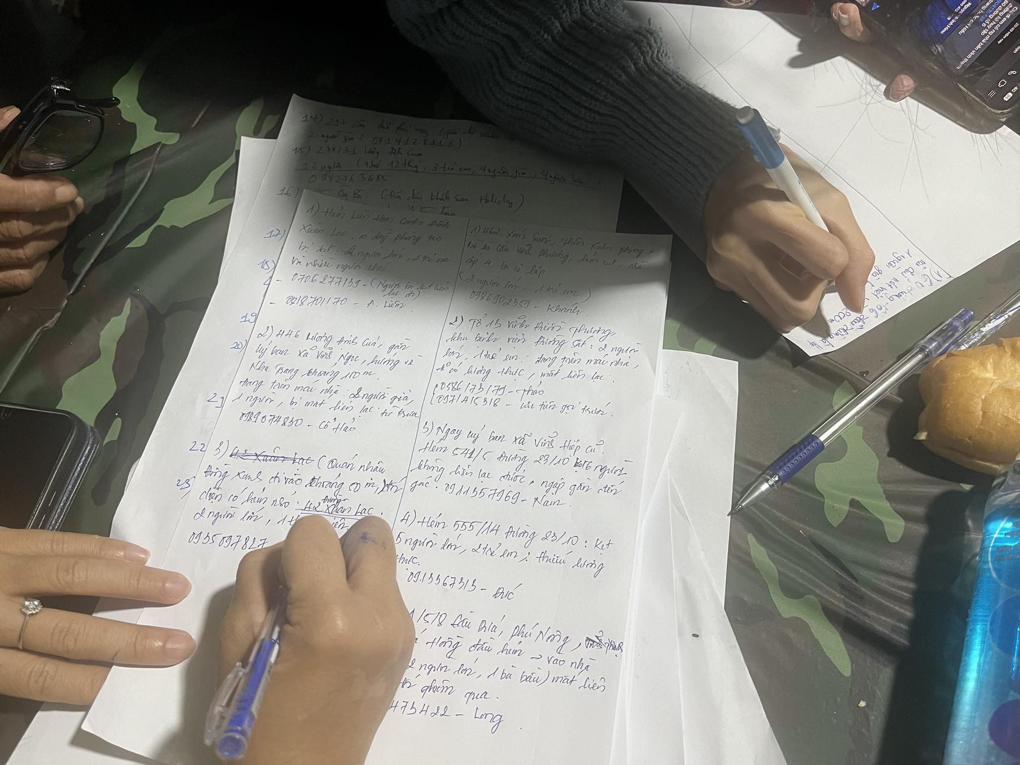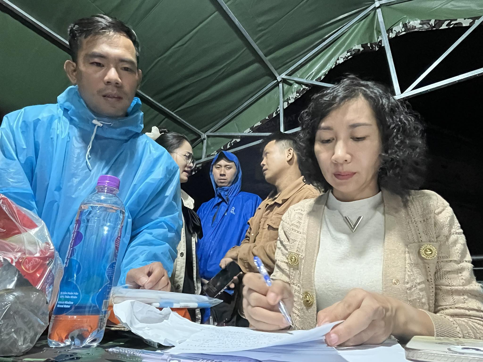 Dưới bóng đèn le lói chạy bằng máy phạt điện, cô ngồi cặm cụi ghi lại từng thông tin của người dân có người thân đang bị mắc kẹt ở vùng lũ.