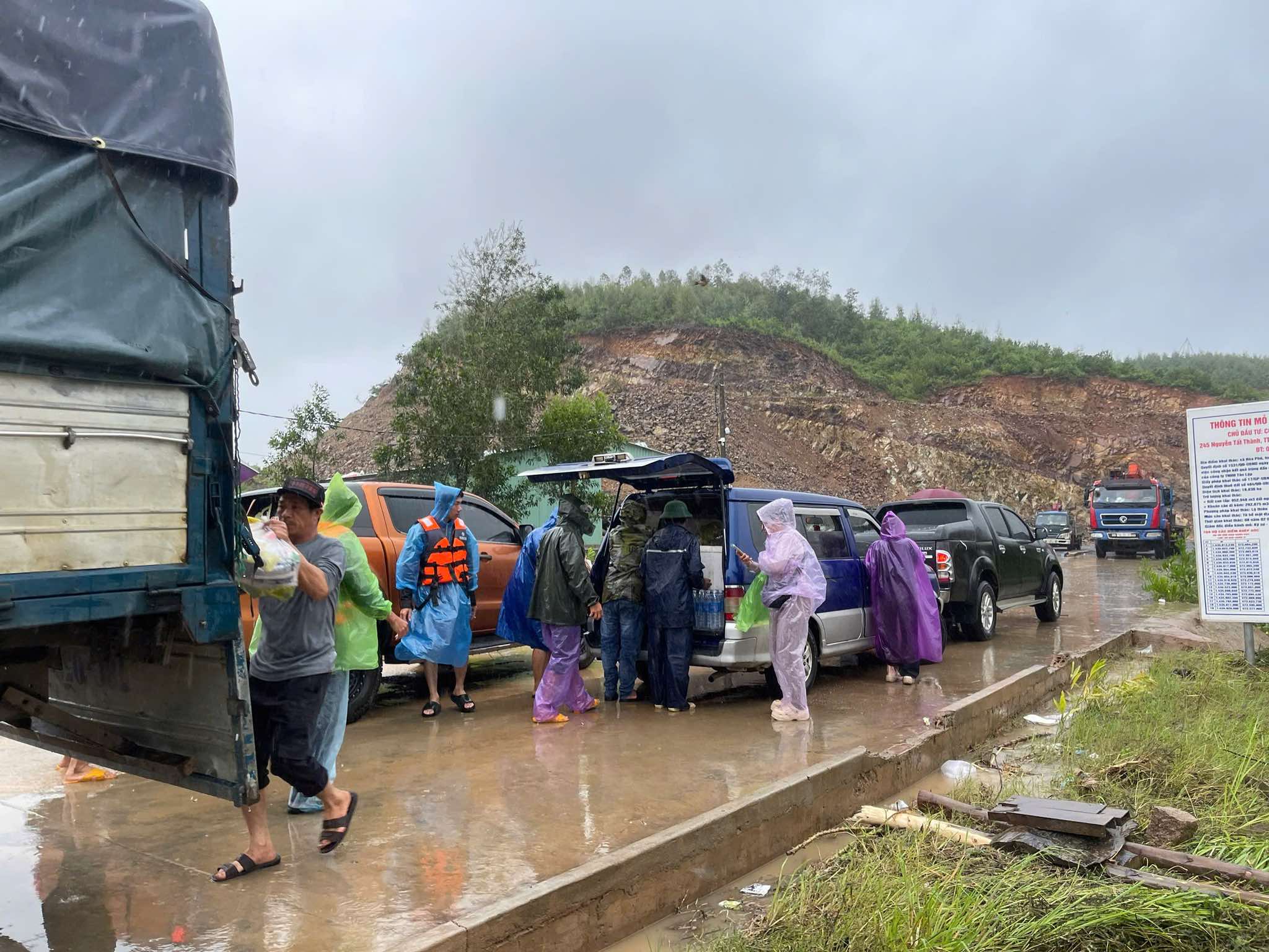 Trên Quốc lộ 1, hàng dài phương tiện nối đuôi nhau né lũ suốt hàng chục ki-lô-mét. Nhiều tài xế được người dân cho vào nhà tá túc, hoặc trú tạm trên xe.