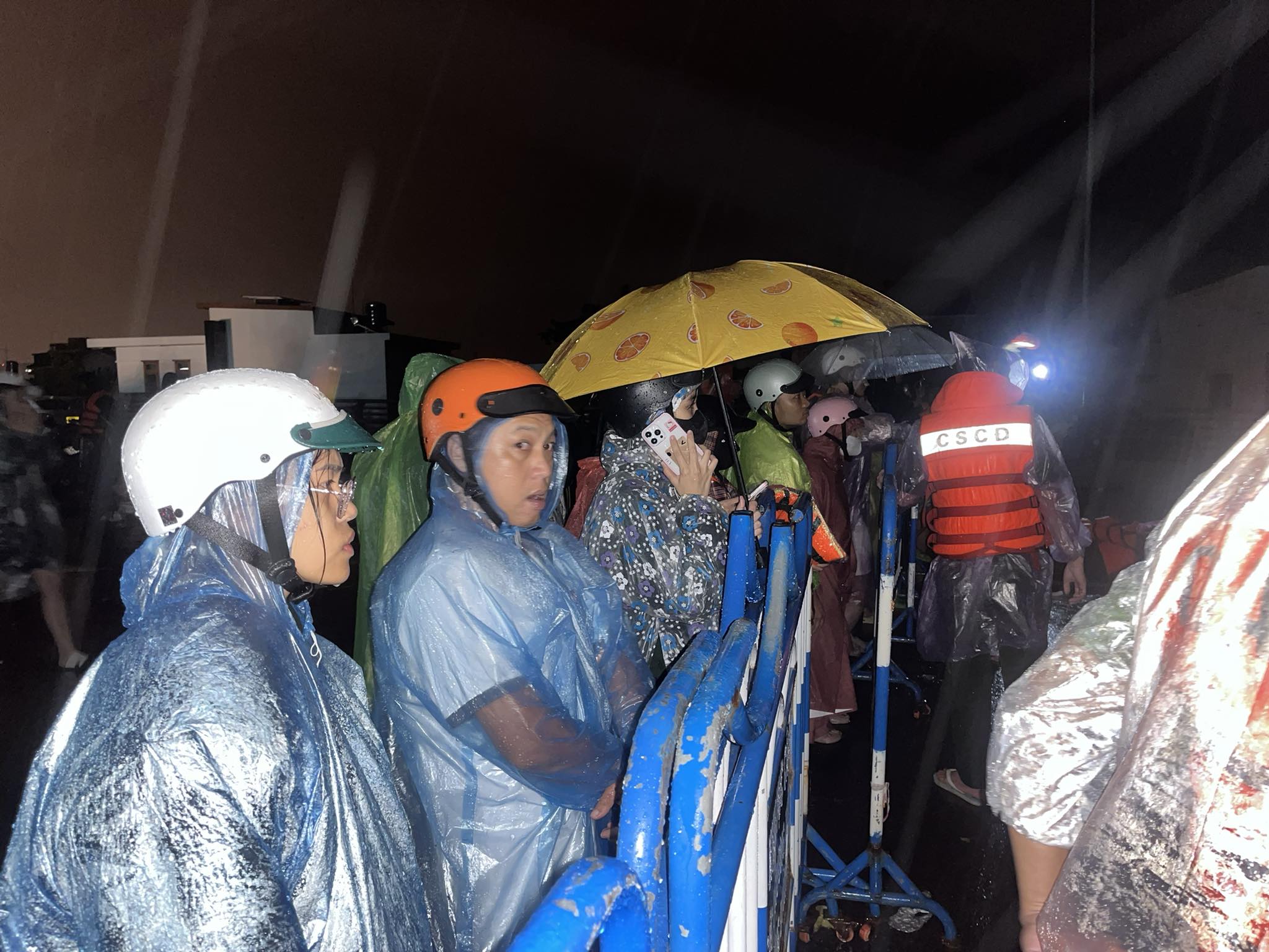 Gần nửa đêm, hàng chục người dân vẫn đứng đợi tại khu vực tập kết người được cứu hộ từ vùng ngập lụt ra ngoài, ai cũng hy vọng người thân được đưa ra ngoài sớm nhất có thể vì hiện nước lũ đang dâng trở lại - Ảnh: NGUYỄN HOÀNG