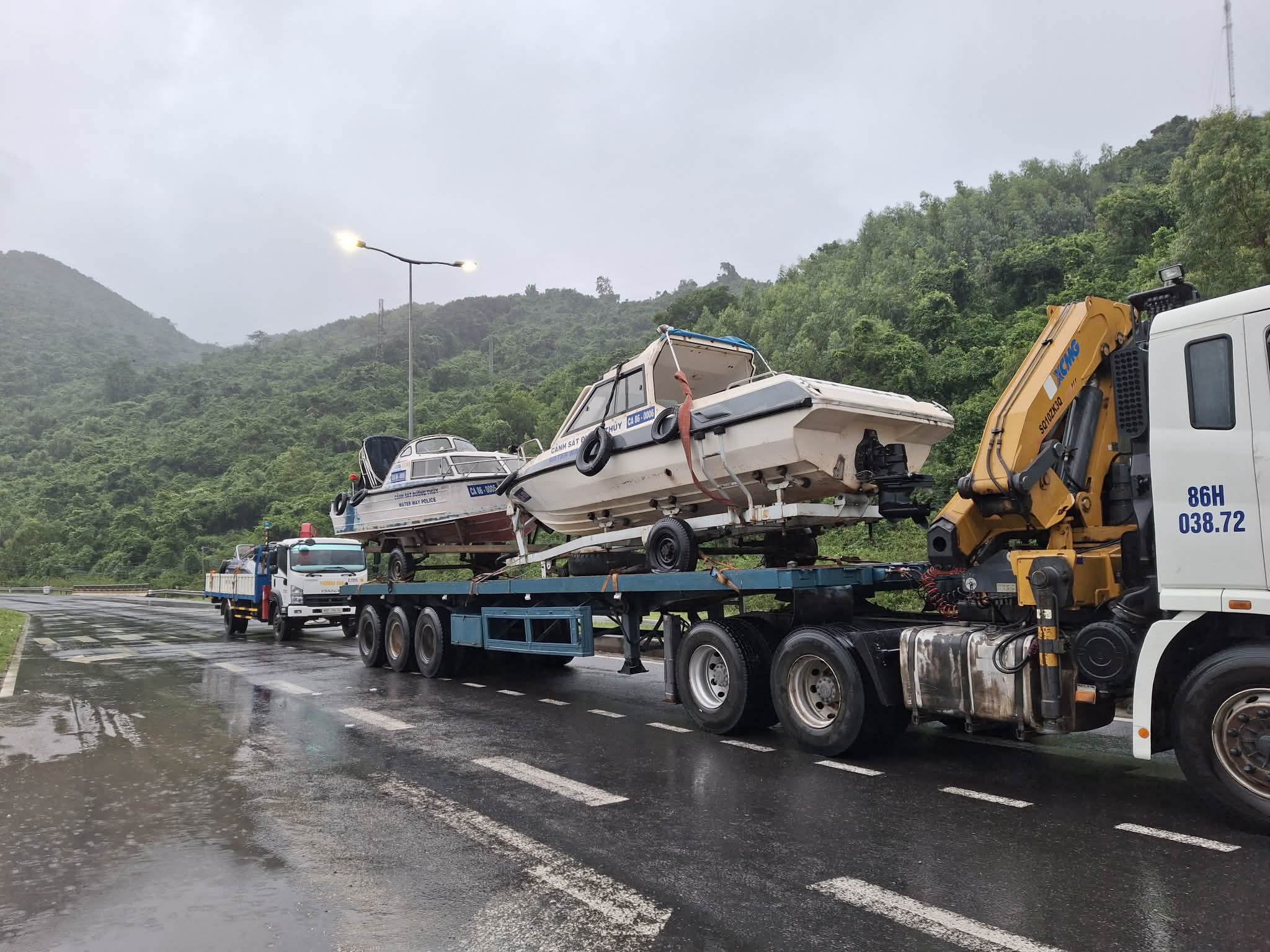 Từ rạng sáng 21-11, đoàn cứu hộ của Công an tỉnh Lâm Đồng vận chuyển 3 chiếc ca nô phải tạm dừng lại tại chân đèo Cổ Mã, xã Đại Lãnh (Khánh Hòa).
