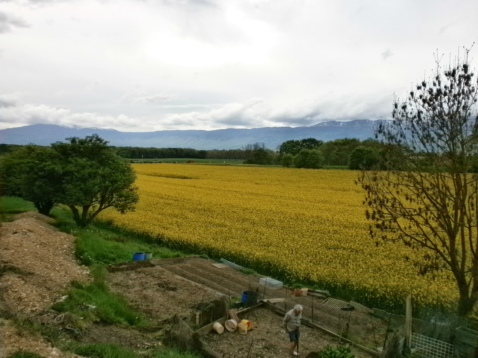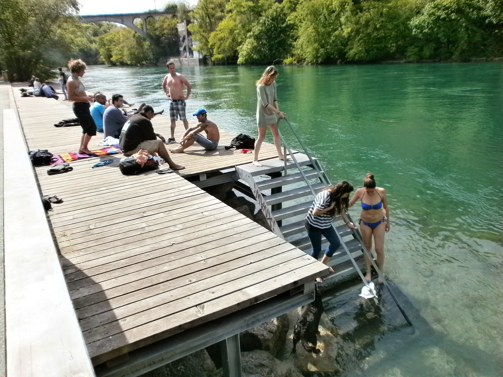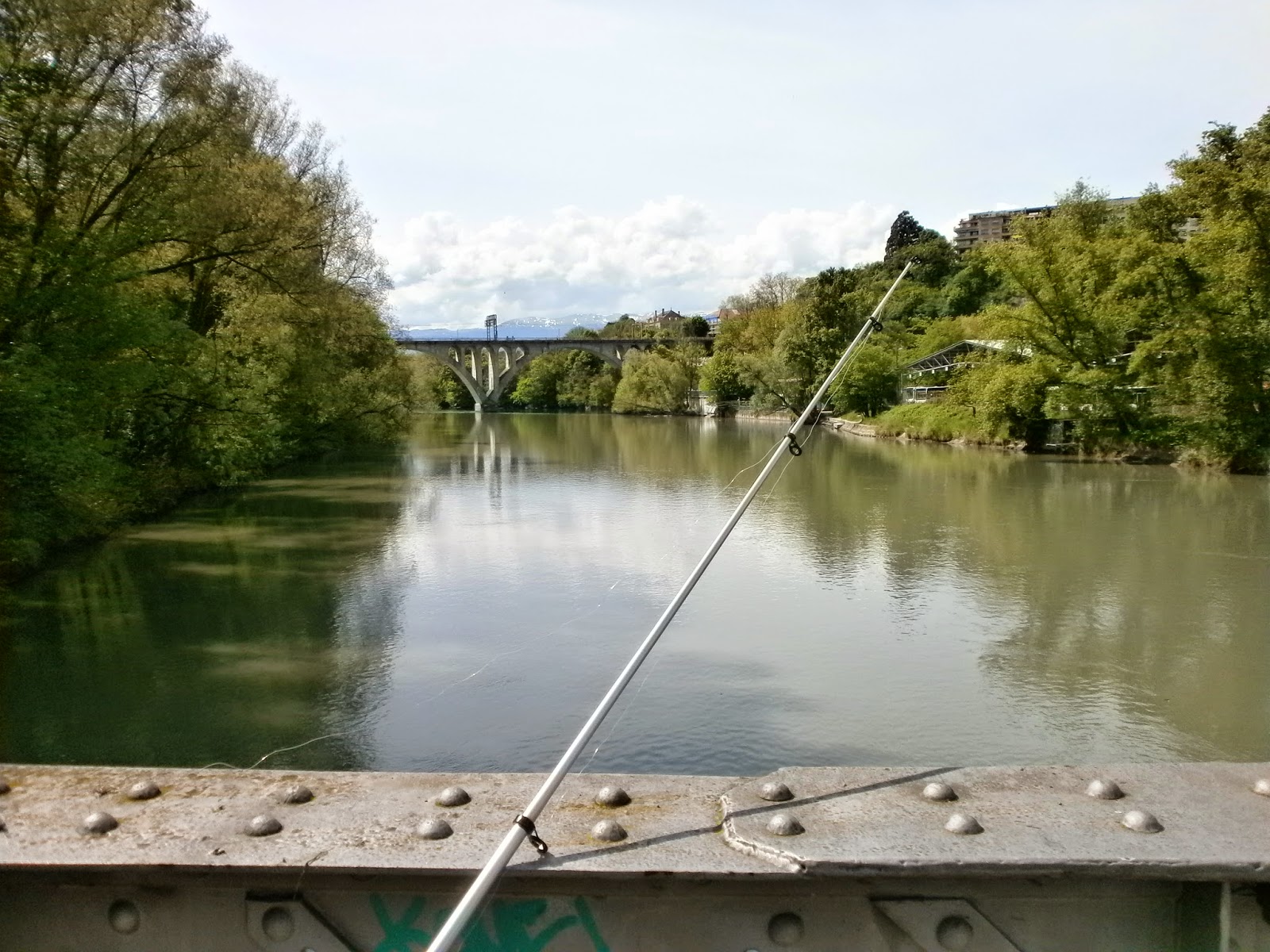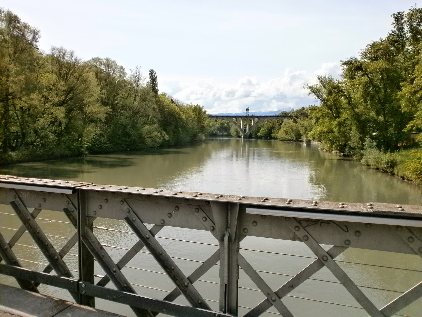 Đứng trên cầu nhìn sông Arve và hướng về hồ Genève, núi Salève nhỏ.