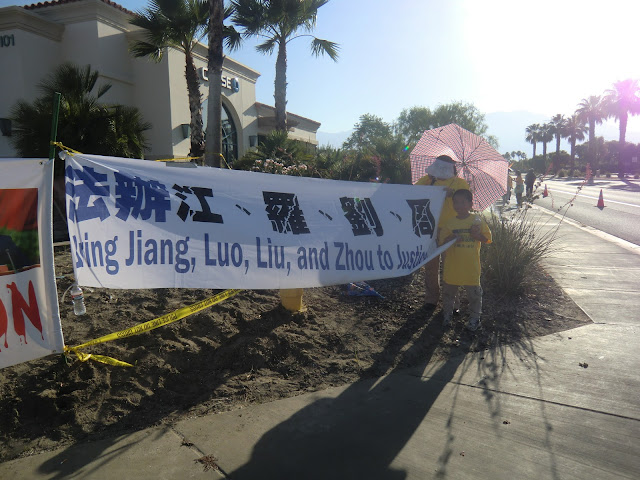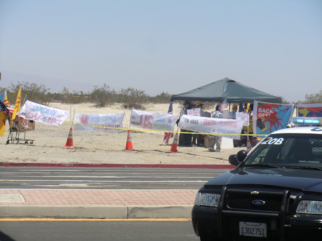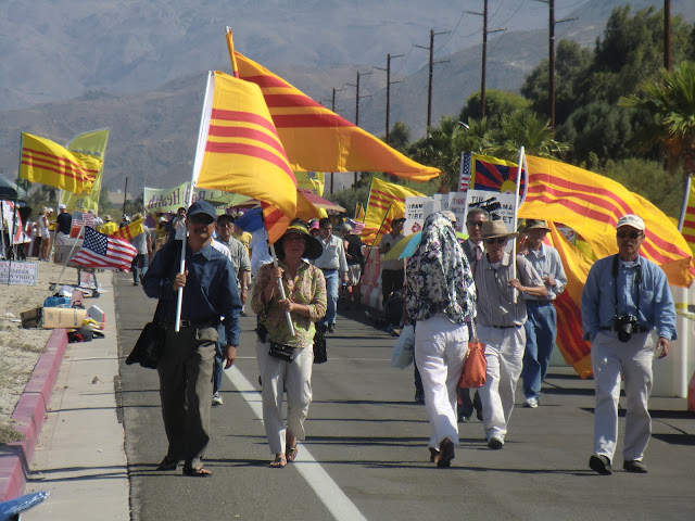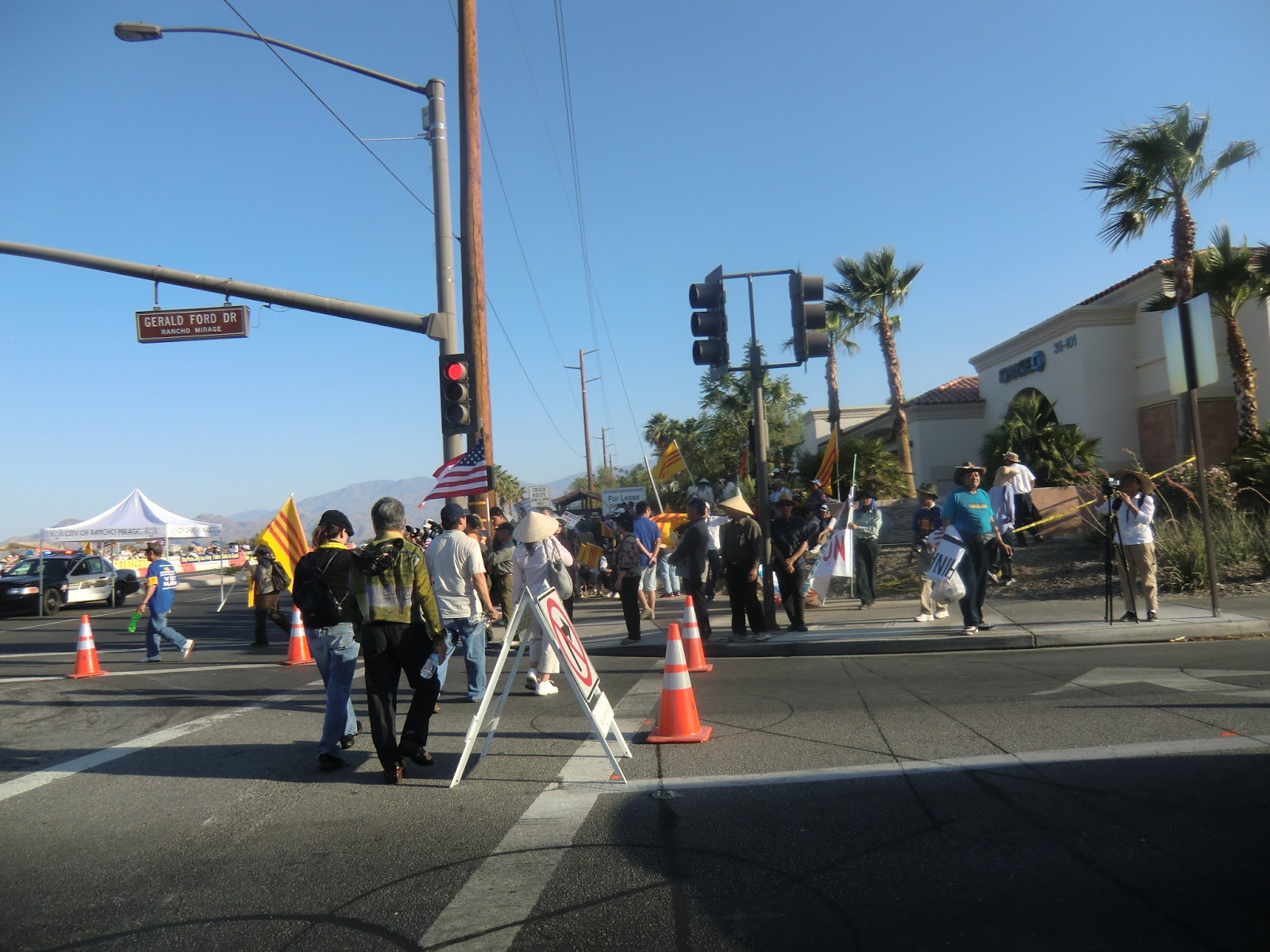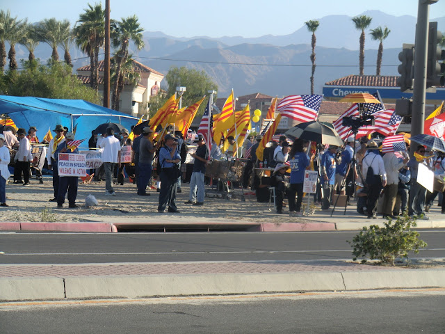 Nhìn góc đường Bob Hope từ freeway I-10 tiến vào, cả một bãi sa mạc cát trắng phau, vắng hoe không một bóng người; chúng tôi phân vân không biết đoàn biểu tình đứng đâu, đến góc đường Gerald Ford thì thấy một hai cái lều và một số người ngồi trú nắng, cờ vàng và khẩu hiệu phất phới vì gió sa mạc; chúng tôi bàn nhau đi một vòng thăm thú tình hình. Những con đường sạch đẹp, cây cối được chăm tiả gọn ghẽ, những biệt thự xinh xắn nấp dưới những tàng cây gồi, tất cả những góc đường dẫn vào khu hội nghị đều bị xe cảnh sát đậu làm nút chặn. Đoàn biểu tình bị chặn một khoảng cách khá xa với nơi họp thượng đỉnh.