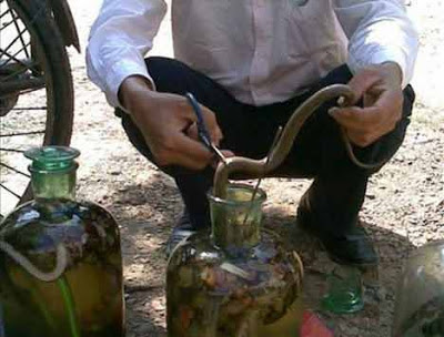 Cả quán vỗ tay rào rào. Thằng bán rắn sắn tay áo , loáng cái đã rạch đôi con rắn dài thước rưỡi, moi ruột gan , móc ra trái mật đen sì cho vào chén rượu hoà tiết đỏ lòm cung kính dâng ông đại tá hưu :