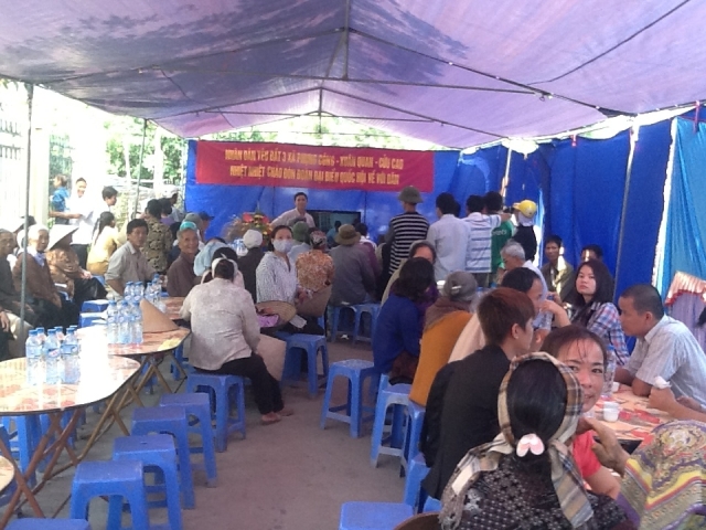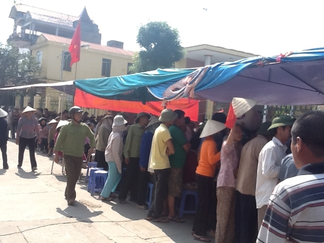 Hàng ngàn người dân ba xã đã sắp hàng hai bên để đón đoàn trong tiếng vỗ tay rộn rã cả một góc làng quê yên tĩnh. Một số công an xã, huyện cũng đang có mặt ở đây.
