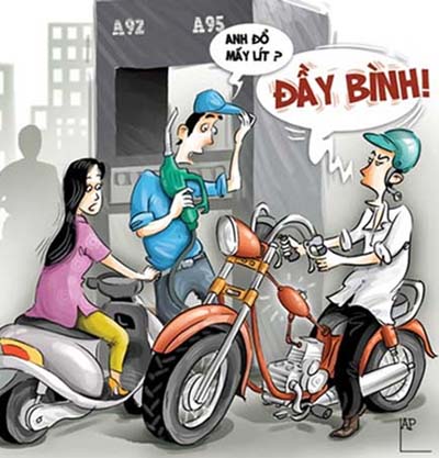 Nhìn lên tấm bảng, người ta thấy:- Thêm nhớt cho cô Liên. Hai lít.