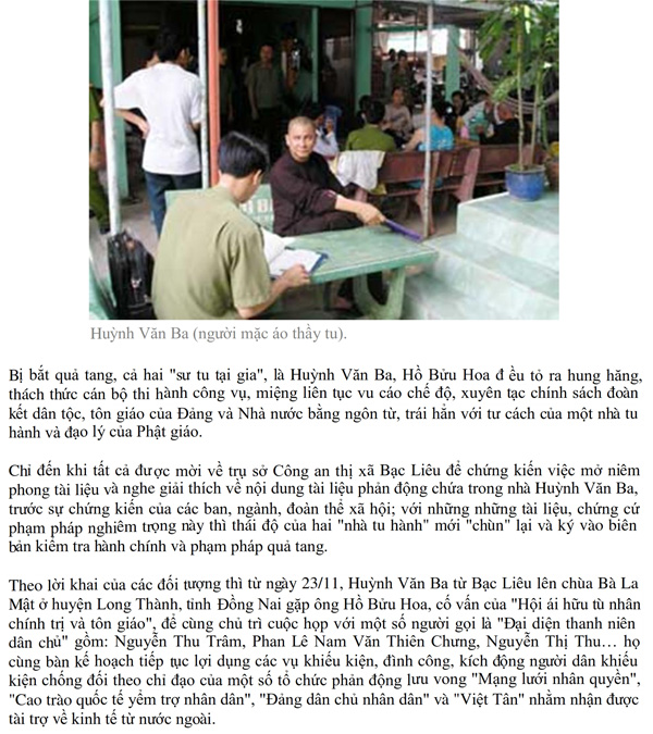 Trong vụ đàn áp này, cơ quan an ninh Bạc Liêu đã tịch thu nhiều máy móc của Thượng Tọa Thích Thiện Minh, tịch thu của tôi 1 điện thoại cầm tay hiệu Nokia 6300, tich thu của bạn Nguyễn Thi Thu số tiền mang theo là 12 triệu đồng, của Hòa Thượng Thích Nhật Ban 2 triệu đồng. Tất cả lai quần, lai áo của chúng tôi đều bị rạch nát. Sau khi bị trục xuất về Sài gòn Thu đã bị rối loạn tâm lý, trầm cảm suốt một thời gian dài từ chối mọi tiếp xúc, kể cả người quen.