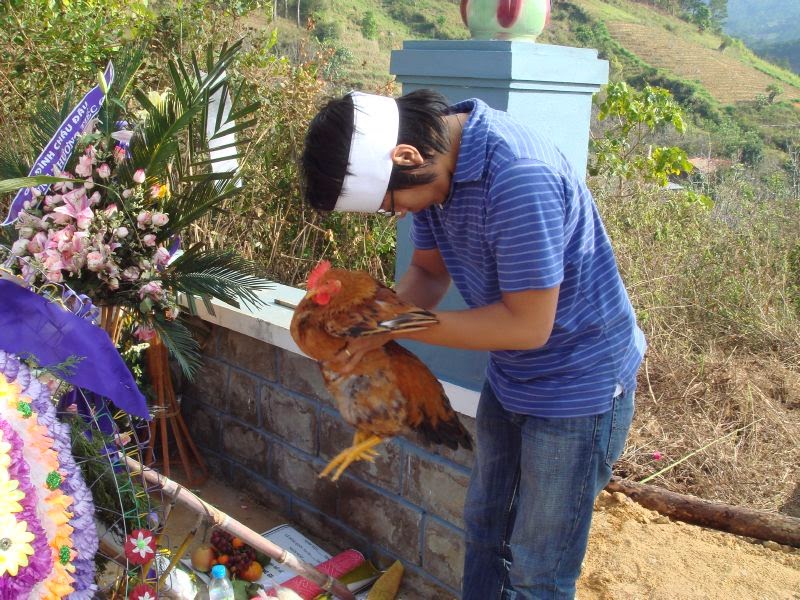 con gà đi 3 vòng quanh ngôi mộ mới. Sau khi cúng xong, người ta bỏ con gà lại tại