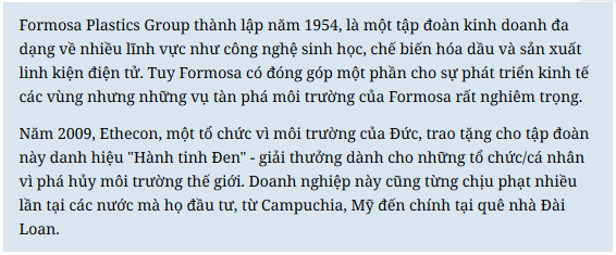 - Ở Đài Loan, Formosa có tiếng xấu khi liên quan tới nhiều vụ ô nhiễm. Vì sao tập đoàn này chưa bao giờ bị truy tố?