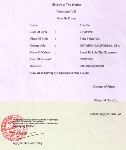 | Biên Bản Khám Xét Nhà và Bắt Giữ Ông Trần Tư ngày 05 tháng 3 năm 1993 tại Sài gòn |