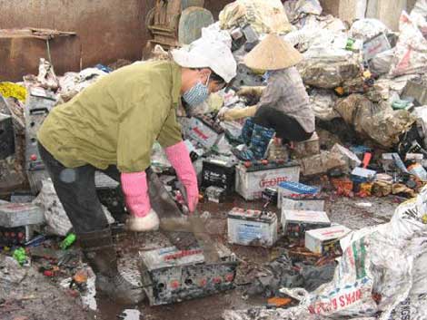 chiếc bình ắc quy hỏng đã qua sử dụng, vứt bỏ ngổn ngang.