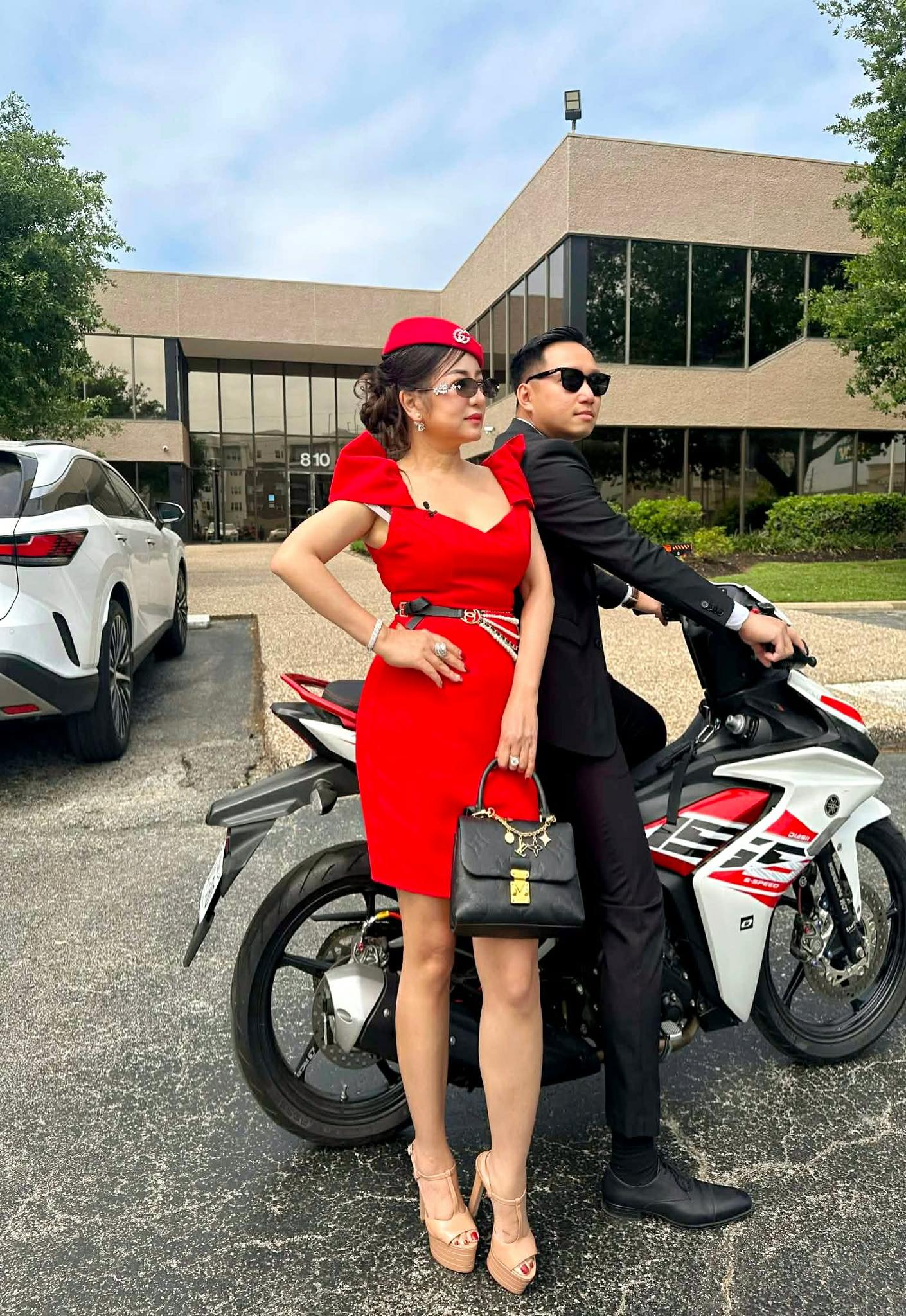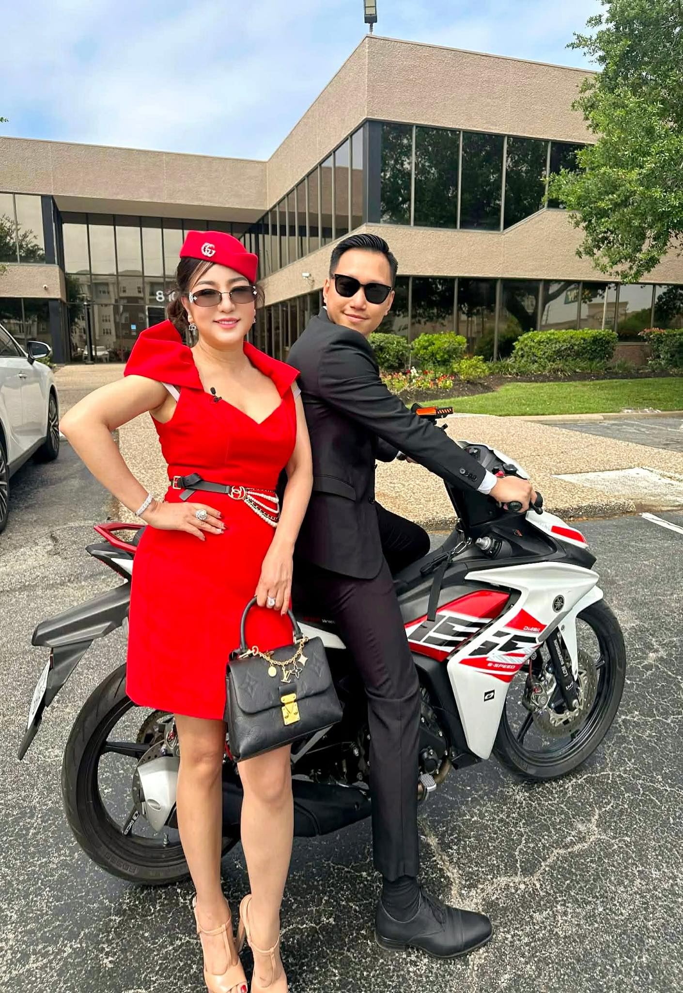 bên chiếc xe phân khối lớn và một người bạn nam lịch lãm, nữ nghệ sĩ gây